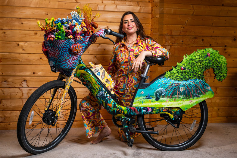 I brought eight vital marine habitats to the streets of Nice through bold illustrations: coral reefs, seagrass, mangroves, open ocean, deep sea, kelp forests, and coastal ecosystems, each home to species like manta rays, sharks, cuttlefish, endangered seahorses, and more. I collaborated with Unblurred Signs to wrap the bike in a new plastic-free vinyl, and transformed my illustrations into plant-based hand painted 3D sculptures.